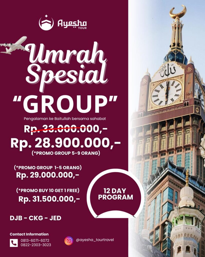 Ayesha Tour menghadirkan Paket Umrah Spesial Group dengan harga hemat dan fasilitas terbaik untuk perjalanan ibadah Anda.