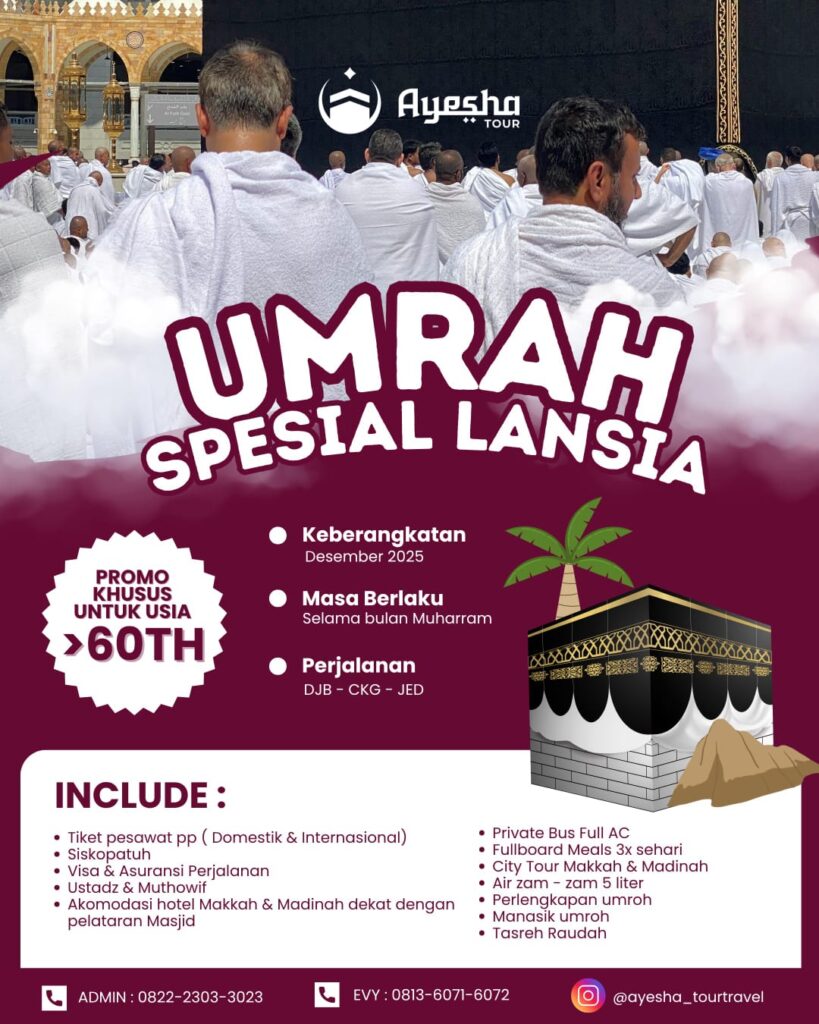 Dengan paket Umrah Spesial Lansia, Ayesha Tour berkomitmen memberikan pengalaman ibadah yang nyaman, aman, dan penuh keberkahan bagi jamaah usia lanjut.